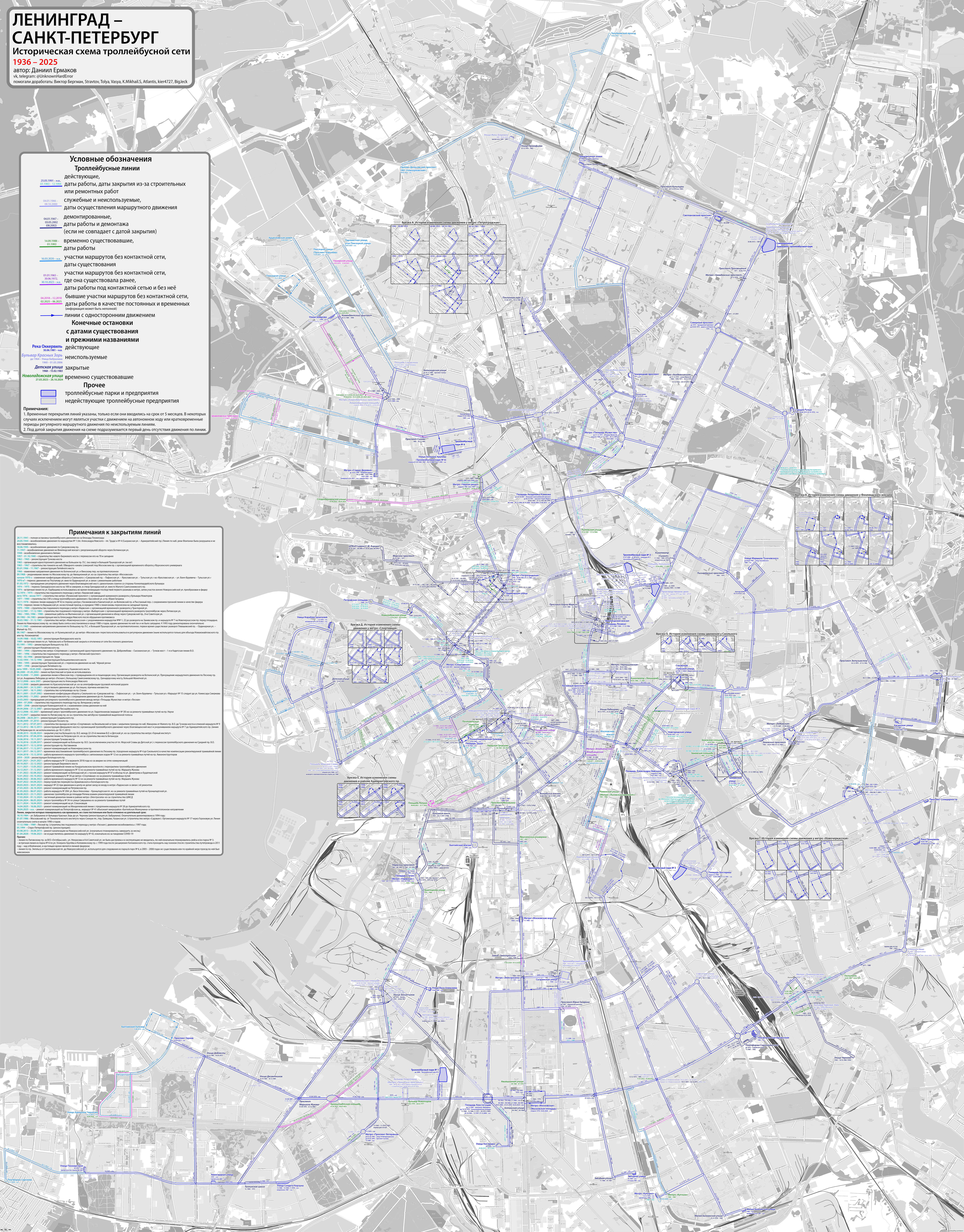 > Мне кажется, я осуществил мечту миллионов. Да ни разу нет. Много неточностей в попытке объять необьятное. Трамвайные линии на схеме вообще лишние, только мешают. Линии ТУАХ тоже мешают, интереснее было бы смотреть схему только существующей/существовавшей контактной сети троллейбуса, но это моё субъективное мнение. Узлы типа у Петроградской или у Смольного, на которых несколько раз менялась схема движения нагляднее бы смотрелись в отдельных выносках. На Ярославской, например, движение менялось на противоположное. пл. Калинина - разворот был за к/т "Гигант" по ул. Васенко https://transphoto.org/photo/2098739/ Там же был и второй путь к/ст. по Стахановцев было временное двухстороннее движение https://transphoto.org/photo/434646/ Автовский ДСК - было две линии https://transphoto.org/photo/1450485/ Аналогично второй путь был на Лебедева перед Комиссара Смирнова У Московский пл. сначала движение было только по южному проезду ул. Типанова https://transphoto.org/photo/1330925/ По Зоологическому переулку было двухстороннее движение https://pastvu.com/_p/a/i/s/a/isaje363kfjt8tsf3f.jpg Из троллейбусного парка № 3 второй выезд стрелки см. на яндекс-панорамах, появились прим. после 2022 С сортировочного моста был левый поворот на Седова https://pastvu.com/_p/a/e/a/0/ea0418a533...015.jpg По Бабушкина между Ивановской и Бульваром Красных зорь было двухстороннее движение https://pastvu.com/_p/a/w/i/p/wip931izvbhetqq5qb.jpg https://pastvu.com/_p/a/i/r/t/irtezgzhuu7wfv6cyt.jpg Разворотная площадка у Госпиталя на Народной была на нечётной стороне улицы. В некоторых источниках писали, что линия в трамвайный парк № 4 проходила по Дегтярной улице, требует уточнения. Не вижу временную конечную на Заневском https://transphoto.org/photo/176972/ При ремонте моста А.Невского в 2001 г. объезд был ли объезд через Большеохтинский? Данный факт отображён на схеме транспорта 2001 г. (в наличии не сохранилась). На Новочеркасском пр. в начале нулевых висели крепления похоже от временного левого поворота к Ладожскому. В ожидании публикации висит фото около Исакиевского, там тоже очень всё интересно. Советую смотреть паству в качестве источника. +13
