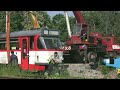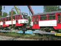 Видео показывает весь процесс доставки — грузовой поезд, в котором везут трамваи, маневровые действия на следующий день, а также процесс разгрузки из железнодорожных вагонов.
